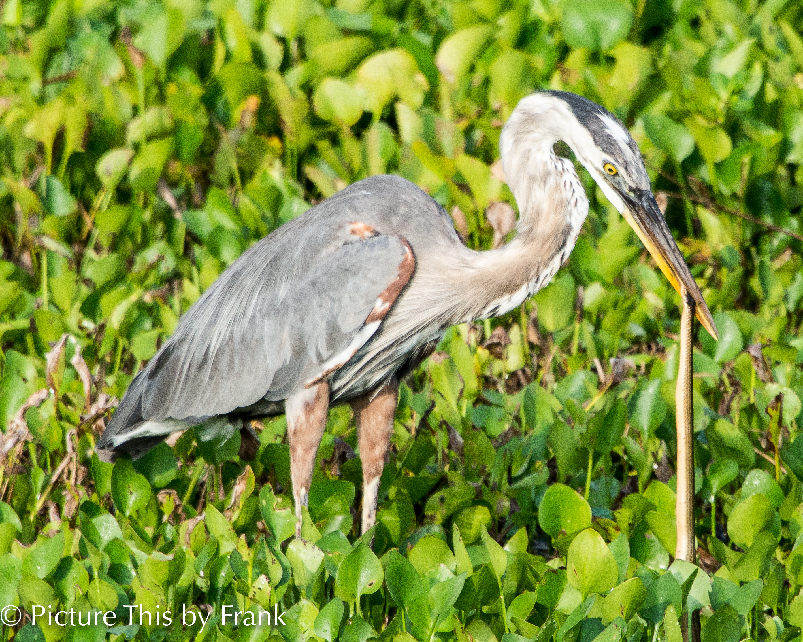 Check out the heron’s eye in the first pic. Looks like some sort of protective eye lid while he struggles with the snake. In the second pic he’s trying to figure out how to eat it.