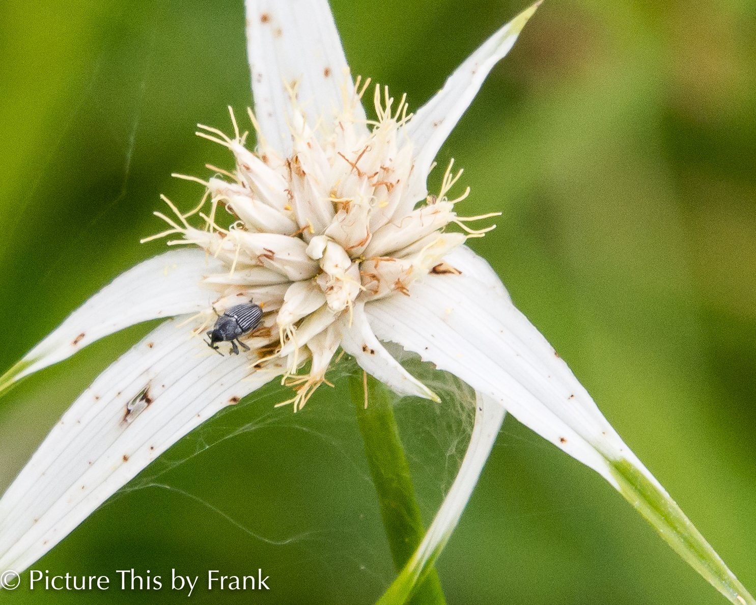 This is a new to me interesting flower. The flower is actually the tiny blooms in the center. The leaves turn white much like a poinsettia. And as always in the ecosystem there are spider webs and a tiny beetle like creature in residence. (see tight crop.)